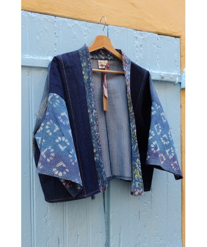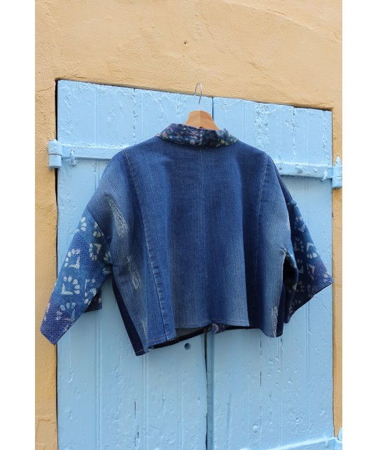 Tissu denim upcyclé et tissu indien ancien brodé et piqué main.